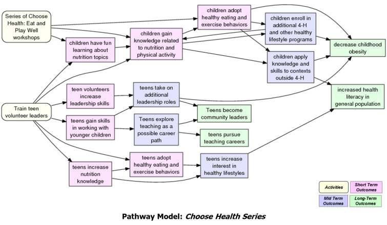 One way for Working Groups to develop pathway models is to create a logic model first, print it out, and then draw arrows from each activity to the associated short-term outcome(s) and then to the associated short- or mid-term, and so on. Alternatively, Working Groups can build the pathway model directly by writing activities and outcomes on index cards and then assembling them on poster paper on a table or wall and drawing in the arrows that represent the process of change they understand for their program. (Figure 4.)
