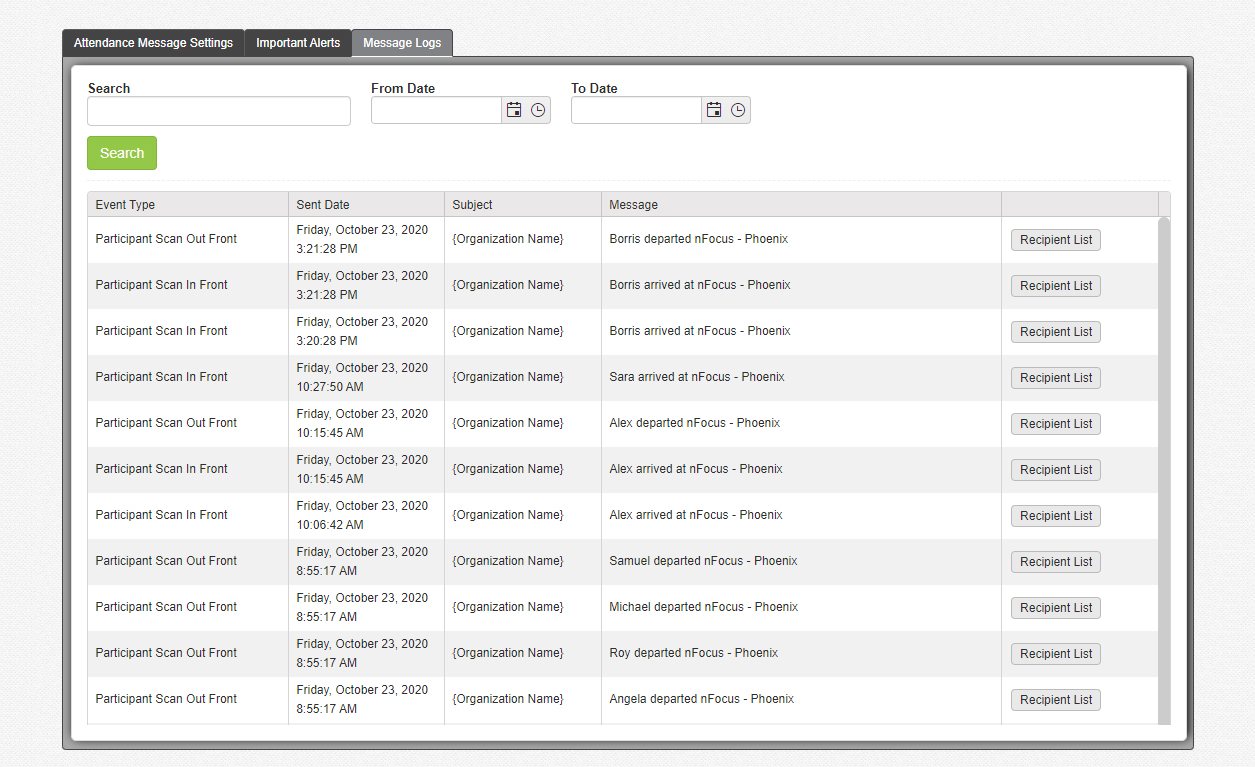 Easily search and view important alerts and participant scan in and scan out attendance messages sent to parents’ mobile devices, and sorted by date range.
